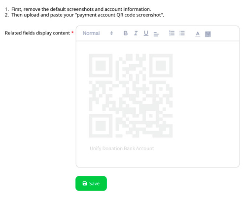 After successful account opening, please save your QR code. Upload it and enter the relevant information in the Unify Donation system when setting up payment methods.